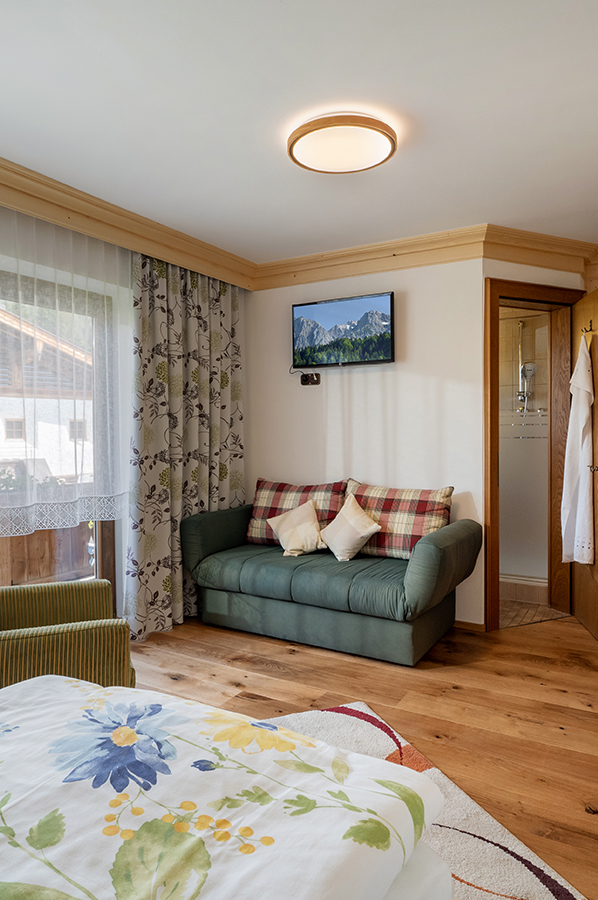 Die voll ausgestattete Küche macht das Kochen zum Vergnügen, während Dusche/WC, zwei Flat-TVs (HD-Ready), kostenloses WLAN, Zimmersafe, Fön, Heizung und Schreibtisch für Komfort und alles Nötige unterwegs sorgen. Vom Balkon aus genießen Sie zudem einen herrlichen Blick auf den Wilden Kaiser – perfekt zum Entspannen und Auftanken.